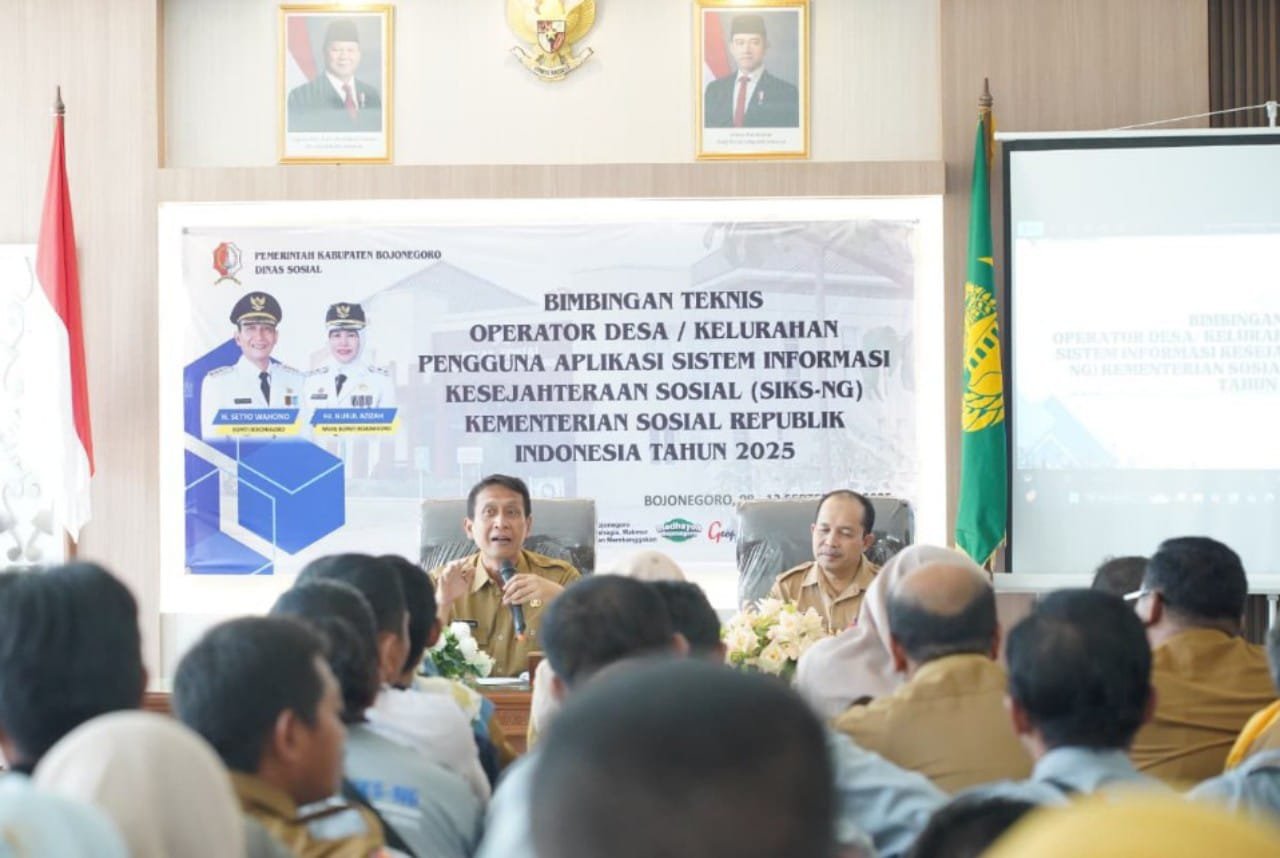 Bojonegoro – wbbnews.id, Bupati Bojonegoro Setyo Wahono hadir dan membuka acara Pelaksanaan Bimbingan Teknis Operator Desa atau Kelurahan Pengguna Aplikasi Sistem Informasi Kesejahteraan Sosial Next Generation (SIKS-NG), Senin, (08/09/2025) di Aula Kantor Dinas Sosial.