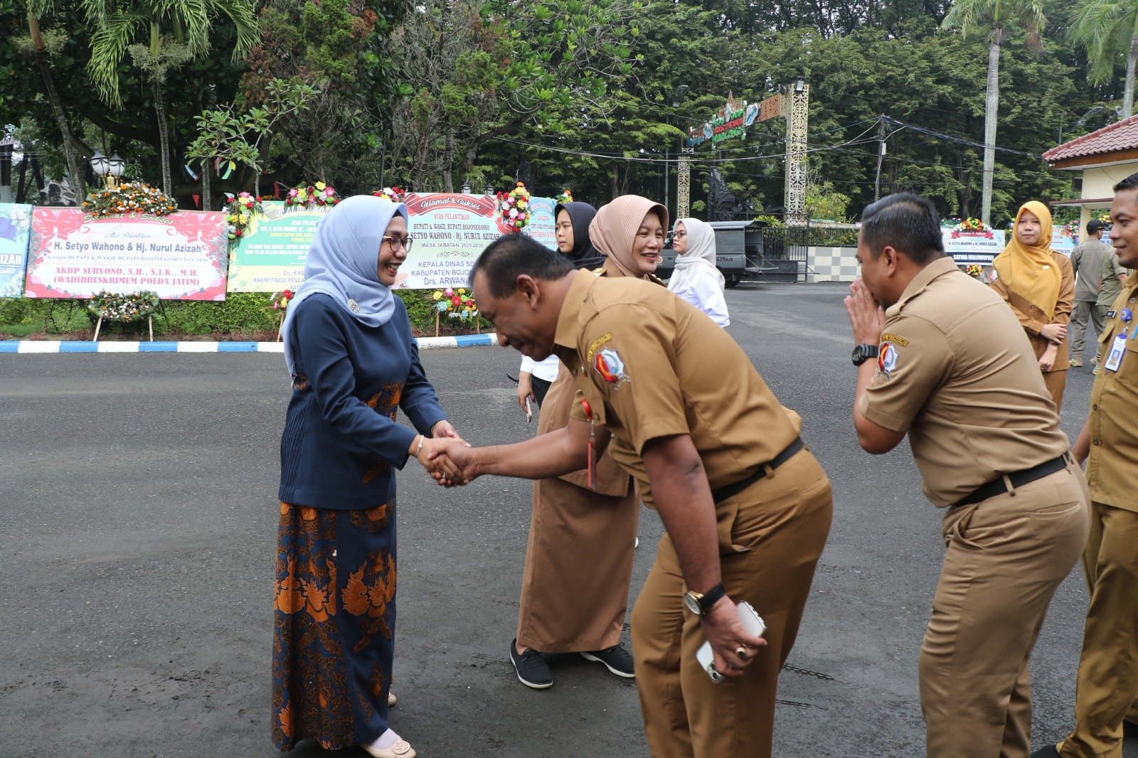 Bojonegoro – wbbnews.id, Ketua TP PKK Kabupaten Bojonegoro, Cantika Wahono bersama Wakil Bupati Bojonegoro, Nurul Azizah apel pagi karyawan karyawati lingkup Pemkab Bojonegoro.ย Adapun kegiatan apel dilaksanakan di halaman Pendopo Malowopati Bojonegoro. Senin (24/02/2025). Dan diikuti mualai Pj. Sekda Kabupaten Bojonegoro, Asisten Daerah, Kepala OPD dan Camat se- Kabupaten Bojonegoro.