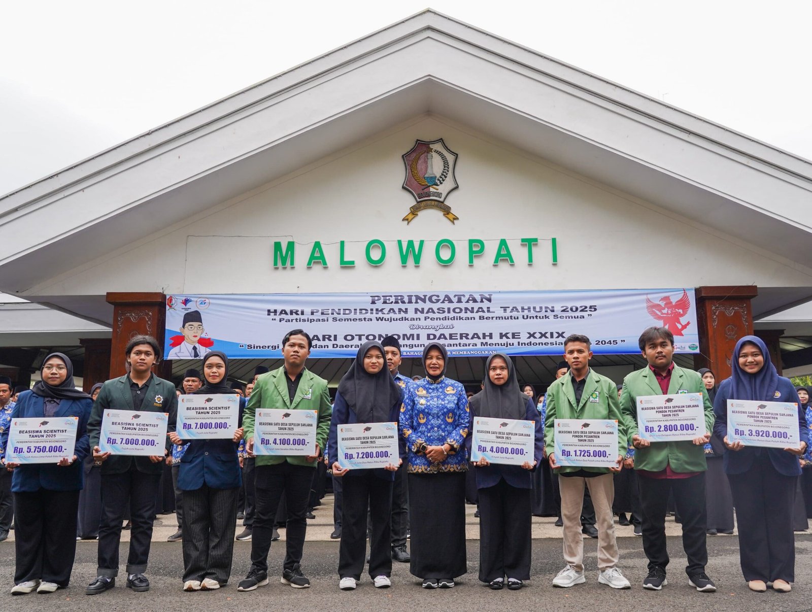 Dalam Upacara pagi itu, Nurul Azizah sekaligus memberikan beasiswa secara simbolis kepada 9 Mahasiswa/i asal Bojonegoro yang menempuh pendidikan Perguruan Tinggi baik di Luar maupun di Bojonegoro.
