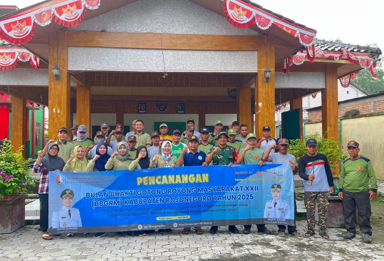 Bojonegoro – wbbnews.id, Bulan Bhakti Gotong Royong Masyarakat (BBGRM) merupakan perayaan tahunan yang sangat penting dalam menunjang semangat gotong royong di antara warga. Dalam hal ini, Pemerintah desa Prayungan, Kecamatan Sumberrejo, Kabupaten Bojonegoro, secara rutin melaksanakan BBGRM dengan kegiatan membersihkan lingkungan. Jum’at (23/05/2025).