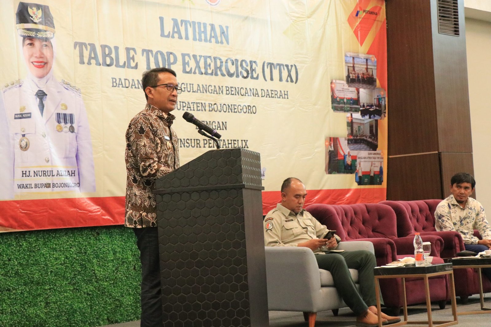 Dalam sambutannya, Setyo Wahono mengapresiasi kegiatan ini dan menekankan pentingnya kolaborasi seluruh elemen masyarakat dan pemerintah dalam upaya mitigasi dan penanganan bencana. Hal ini menunjukkan komitmen Pemerintah Kabupaten Bojonegoro dalam mempersiapkan dan melindungi masyarakat dari berbagai risiko bencana, termasuk yang spesifik terkait kegagalan teknologi di sektor industri, sejalan dengan amanat Undang-Undang Nomor 24 Tahun 2007 tentang Penanggulangan Bencana dan Peraturan Pemerintah Nomor 21 Tahun 2008 tentang Penyelenggaraan Penanggulangan Bencana.