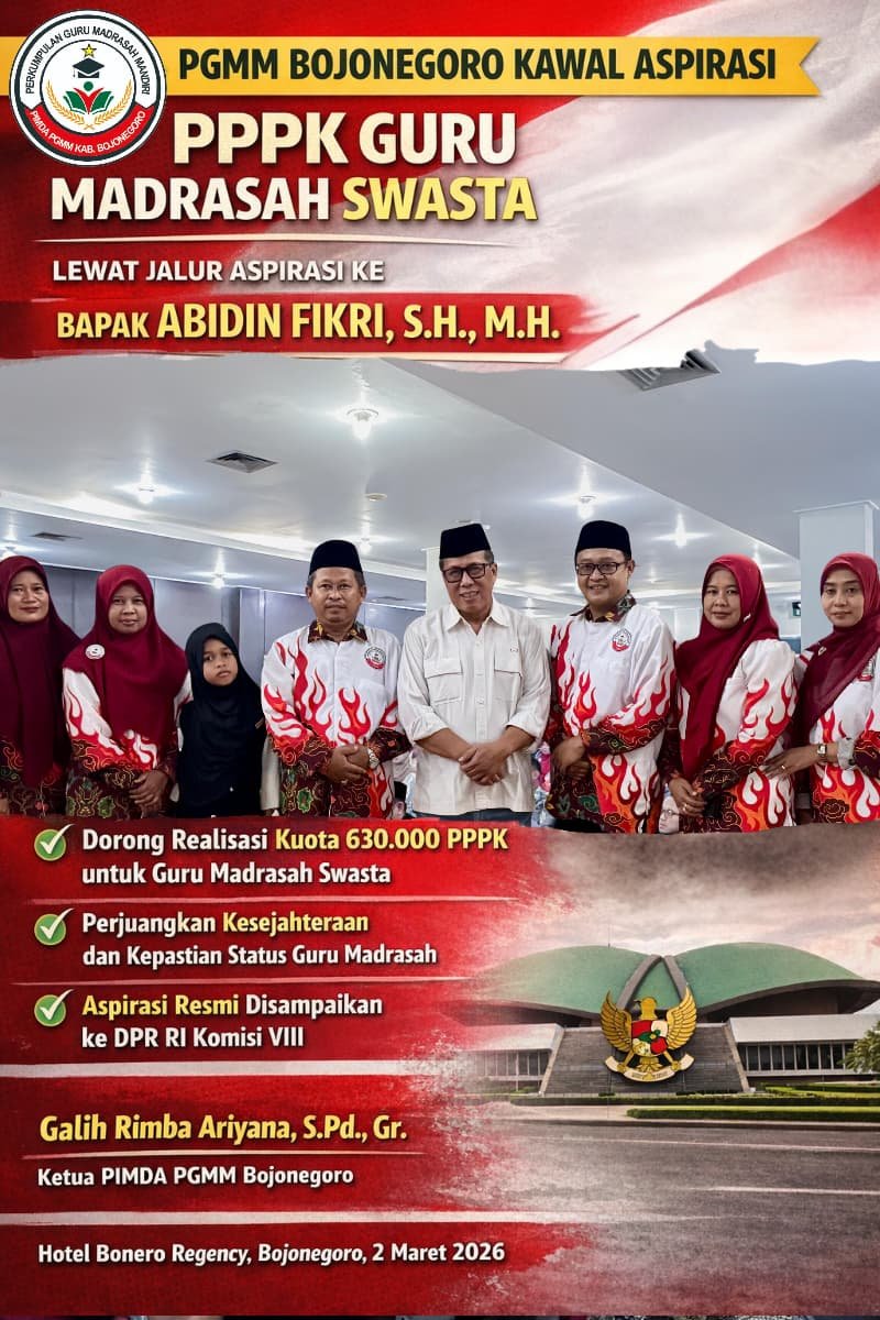 BOJONEGORO โ€“ย  wbbnews.id, Perkumpulan Guru Madrasah Mandiri (PGMM) Kabupaten Bojonegoro terus mengawal aspirasi guru madrasah swasta terkait Pegawai Pemerintah dengan Perjanjian Kerja (PPPK). Pengawalan ini dipimpin langsung Ketua PIMDA PGMM Bojonegoro, Galih Rimba Ariyana, S.Pd., Gr, bersama jajaran pengurus melalui jalur aspirasi resmi kepada pemerintah pusat. Kegiatan tersebut berlangsung pada Senin, (02/03/2026) di Hotel Bonero Regency PGMM Bojonegoro.