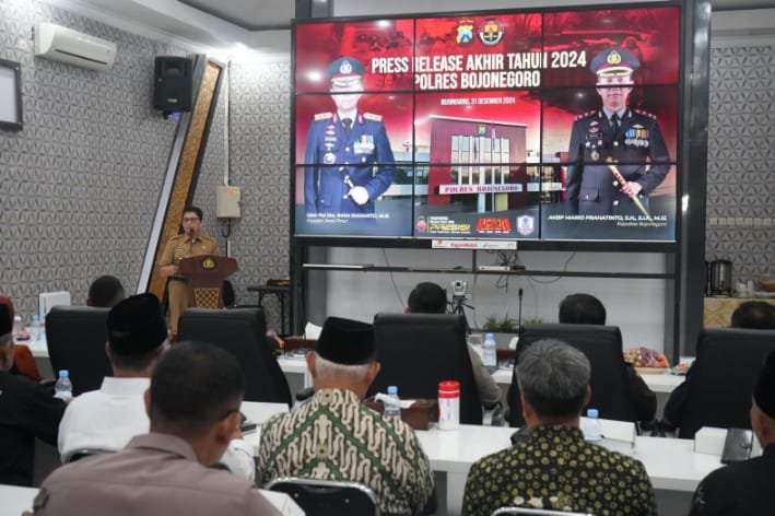 Bojonegoro – wbbnews.id, Pj Bupati Bojonegoro hadiri Press Realese Akhir Tahun 2024 di Mapolres Bojonegoro, Selasa (31/12/2024). Dalam kesempatan tersebut Adriyanto menyampaikan ucapan terimakasih atas sinergitas dan dukungan Polres Bojonegoro dalam menjaga stabilitas di masyarakat, baik di sektor politik, sosial dan ekonomi.
